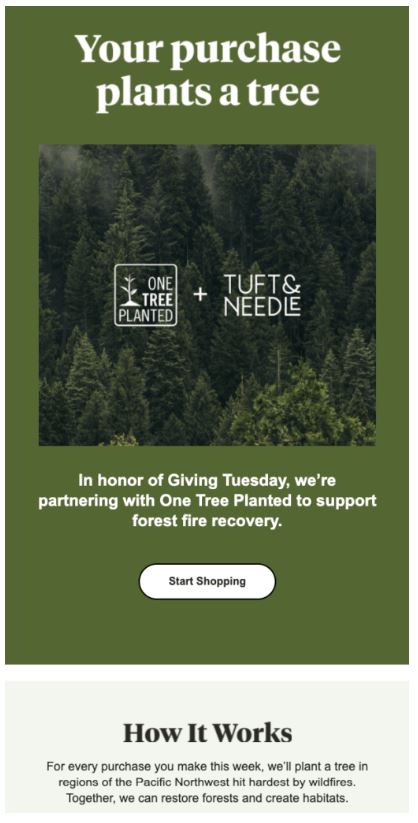تنتهز Tuft & Needle الفرصة لعرض شراكاتهم وإيصال روحهم المستدامة في حملة Giving Tuesday. بينما يبحث المستهلكون اليوم عن صفقة ، فإنهم يريدون أيضًا الشراء من العلامات التجارية التي تتخذ موقفًا واضحًا من القضايا الاجتماعية. هذه الرسالة القائمة على التعاطف تخلق استجابة عاطفية إيجابية تساعد على بناء الثقة والولاء للعلامة التجارية.