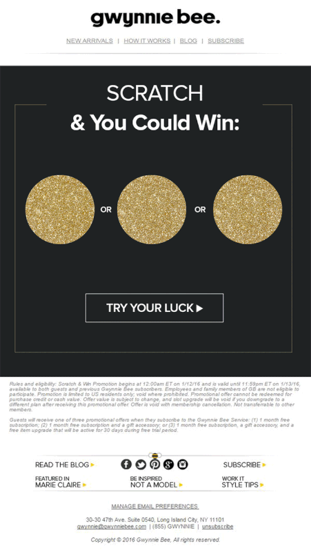 نشرت Gwynnie Bee رسالة البريد الإلكتروني الجذابة لبطاقة الخدش هذه واستفادت من التحفيز لبناء الترقب. البريد الإلكتروني يحتضر ليتم النقر عليه! إنها بسيطة ، لكنها فعالة في تحفيز المشاركة ، وتقدم آليات اللعبة ، وتعد بمكافآت حقيقية. إحالة صديق ، والكلمات المتقاطعة المتحركة ، وآلات القمار ، وغيرها من حملات النقر للكشف ، كلها تجعل الانخراط في تجربة إيجابية.