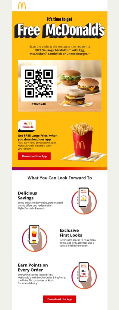 تأمل هذا المثال من ماكدونالدز. ما هي احتمالات زيارة المستهلك لموقع ما للحصول على أكثر من McMuffin مجاني؟ المزيد من الهدايا المجانية تقدم نفسها في هذا البريد الإلكتروني بناءً على إجراءات المشترك. في كثير من الحالات ، يمكن أن توفر الهدية المجانية للعلامة التجارية إمكانية تبادل البيانات أو زيادة التفاعل مع العلامة التجارية.