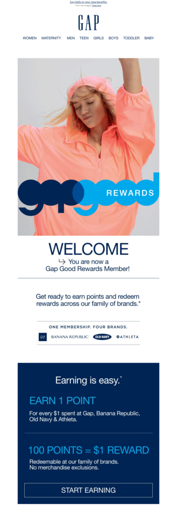 على سبيل المثال ، يحافظ برنامج Good Rewards من GAP على إستراتيجيتهم واضحة وموجزة. في رسالة ترحيب الولاء الخاصة بهم ، شرحوا نظامهم في كتلة محتوى واحدة: دولار واحد تم إنفاقه = نقطة واحدة مكتسبة ، و 100 نقطة مكتسبة = مكافأة 1 دولار.