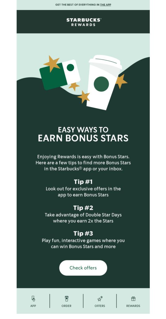 ستاربكس ، على سبيل المثال ، ترسل سلسلة إعداد ولاء للأعضاء الجدد. البريد الإلكتروني الثالث في السلسلة هو مثال ممتاز لتجاوز مخطط المعلومات الرسومي "كيف تربح" من خلال توفير ثلاث طرق يمكن للمشتركين من خلالها زيادة أرباح "النجوم" إلى أقصى حد.