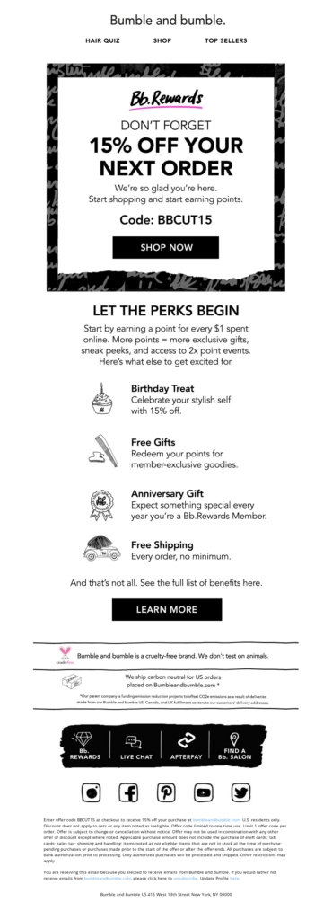 يعرف Bumble and Bumble هذا ويرسل رسائل الولاء التي تسلط الضوء على عدد لا يحصى من فرص الخصومات والهدايا التي تأتي مع العضوية. إنها توفر خصمًا بنسبة٪ ، وشحنًا مجانيًا ، وهدايا ، بالإضافة إلى هدايا أعياد الميلاد والذكرى السنوية للعضوية لخلق قيمة هائلة للأعضاء فقط.