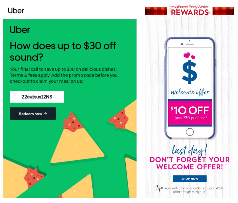 البريد الإلكتروني الخاص بـ Uber الذي يحتوي على سطر الموضوع "لقد انتهت صلاحية خصمك الذي يصل إلى 30 دولارًا تقريبًا" ويقدم برنامج Bath & Body Works هذا تذكيرًا بانتهاء الصلاحية هما مثالان رائعان على رسائل البريد الإلكتروني الخاصة بانتهاء صلاحية النقاط / المكافآت. المكالمات النهائية ورسائل الفرصة الأخيرة عبر البريد الإلكتروني تخلق إحساسًا بالإلحاح الذي يؤدي إلى النقرات والتحويلات ، كل ذلك مع ضمان بقاء المشتركين على اطلاع دائم بحساباتهم.
