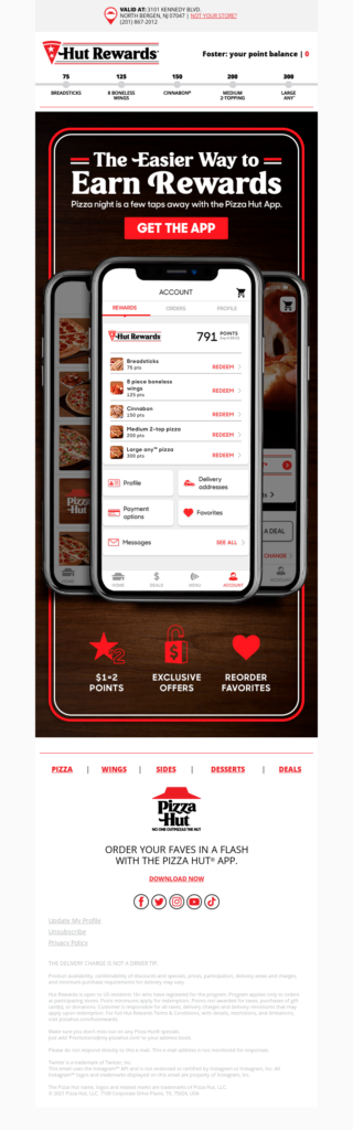 تقوم بيتزا هت بهذا بشكل مثالي لبرنامج Hut Rewards الخاص بهم. هذا البريد الإلكتروني مخصص بالكامل للمطالبة بتنزيل التطبيق ويعرض جميع الفوائد التي يوفرها التطبيق لأعضاء الولاء. تعمل ملخصات النقاط والمنتجات القابلة للاسترداد بناءً على أرصدة النقاط بالإضافة إلى خيارات الدفع البسيطة وتسليم البيتزا معًا لإنشاء تجربة طلب إيجابية وبسيطة للمشتركين الجائعين.