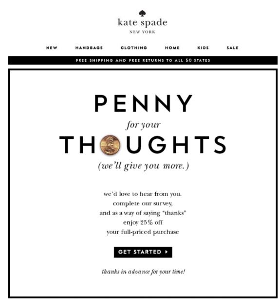 تطلب Kate Spade آراء المشتركين من خلال رسالة بريد إلكتروني للاستبيان. للحث على مشاركة المشتركين ، يقدمون خصمًا كبيرًا بنسبة 25 ٪ على العناصر كاملة السعر ويشكر المشترك مقدمًا على إكمال الاستبيان. إنه الفوز! تتلقى Kate Spade تعليقات قيمة وقابلة للتنفيذ ويشعر المشترك بالتقدير (ويمكنه التسوق). تضمن رسائل البريد الإلكتروني هذه أن يظل برنامجك ملائمًا ويسمح للمشتركين بالشعور بأنهم جزء من عمليتك.