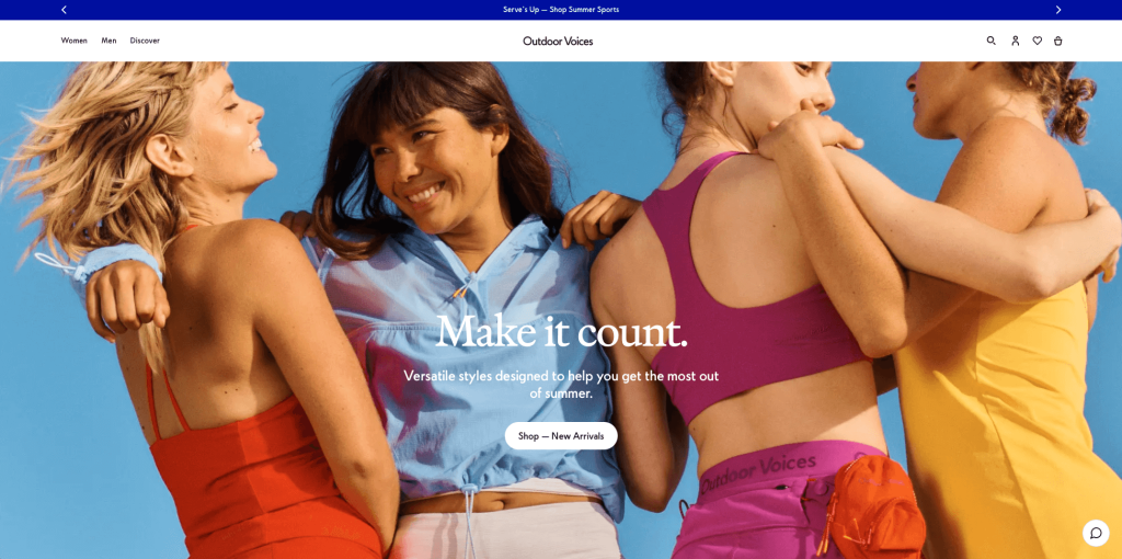 Outdoor Voices هو موقع إلكتروني حديث وأنيق يبيع الملابس الرياضية لكل من الرجال والنساء. ما يميز موقعهم هو استخدامه للون. لديهم لوحة ألوان محدودة للغاية ، مما يخلق مظهرًا نظيفًا وأنيقًا. تصميمهم بسيط أيضًا ، مما يجعل منتجاتهم نجمة العرض. بشكل عام ، من السهل جدًا التنقل في موقع الويب الخاص بهم ويجعل التسوق عبر الإنترنت ممتعًا وممتعًا. الصفحة الرئيسية مليئة بمقاطع فيديو عالية الجودة تتعلق بالمنتجات وعلامتها التجارية. ومع ذلك ، فإن صور المنتجات واللافتات الجذابة تجذب الانتباه العام.