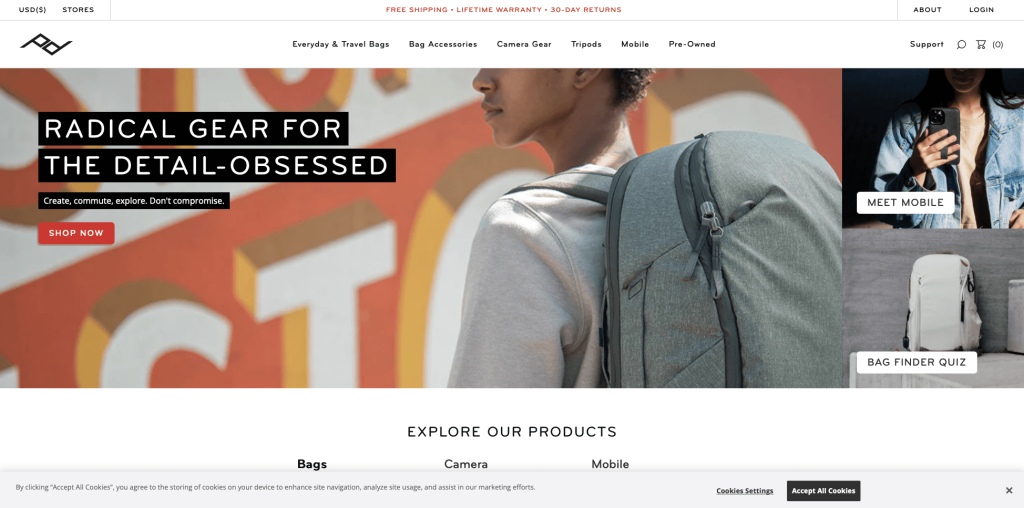 Peak Design هو بائع تجزئة عبر الإنترنت يبيع حقائب الكاميرا وملحقاتها. ما يميز موقع Shopify هذا هو تصميمه النظيف واستخدامه للمسافات البيضاء. تعتبر صفحات المنتج بسيطة ولكنها لا تزال توفر جميع المعلومات الضرورية التي يحتاج العملاء المحتملون إلى معرفتها. بالإضافة إلى ذلك ، فإن صور المنتج كبيرة وجريئة ، مما يسهل تصفح العناصر. هناك تفصيل آخر جدير بالذكر وهو كيفية دمج Peak Design للمسافات البيضاء في تصميم موقعها. في حين أن العديد من مواقع الويب مليئة بالإعلانات والأشياء الأخرى التي تبتعد عن المحتوى ، فلا يوجد أي شيء يشتت الانتباه هنا - مجرد صور للمنتجات ونص ضئيل يشرحها. بالإضافة إلى ذلك ، فإن الرأس الأسود والتذييل يمنحان الموقع مظهرًا بسيطًا وبسيطًا.