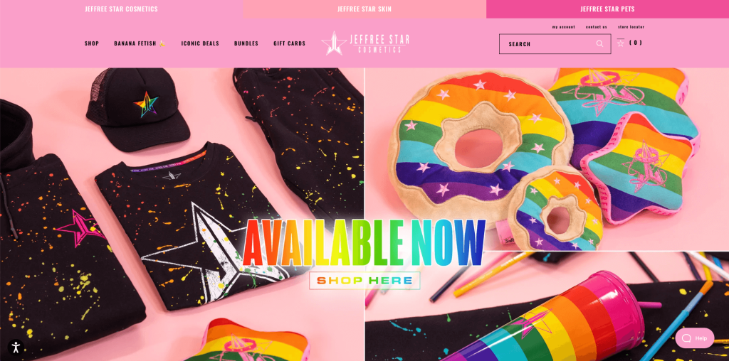 موقع آخر على قائمتنا هو Jeffree Star Cosmetics. هذا الموقع فريد من نوعه بسبب اختيار لونه. الألوان مشرقة للغاية ونابضة بالحياة ، مما يجعل المنتجات تبرز. يضفي اللون الوردي الفاتح للموقع الإلكتروني مع خلفية بيضاء واضحة على الموقع مظهرًا أنثويًا وناعمًا للغاية ويظهر هوية العلامة التجارية. أثناء قيامنا بالتمرير لأسفل الصفحة ، نرى كيف يستمر هذا الموضوع نفسه مع جميع الجوانب الأخرى. الحروف الجريئة تلفت انتباهنا أولاً في علامة التبويب Shop ، حيث يتم عرض مجموعة من الماكياج بفئات مختلفة ، بما في ذلك لوحات ظلال العيون وأحمر الشفاه والليبيز وظلال العيون الفردية والمزيد.