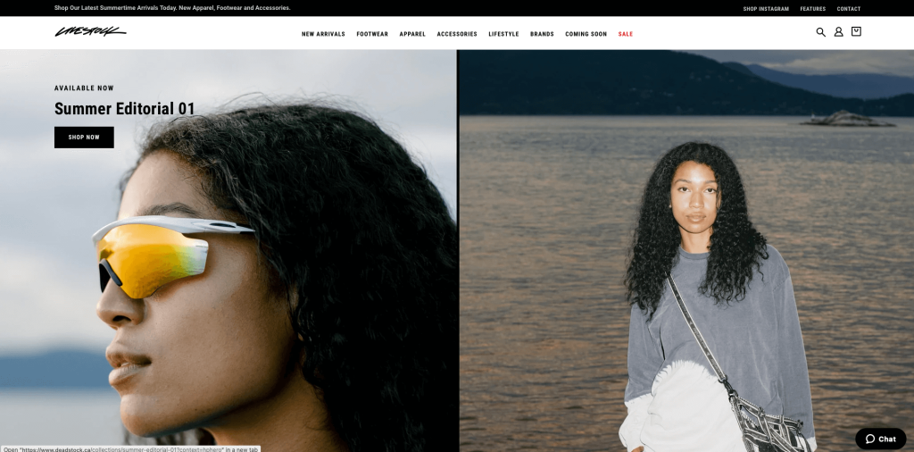 Livestock ، المعروف أيضًا باسم deadstock ، متجر على الإنترنت في كندا يبيع الأحذية الرياضية وملابس الشارع. الجانب الفريد من Deadstock هو استخدامه للون. غالبًا ما يستخدمون ألوانًا مشرقة وجريئة في تصميم مواقع الويب الخاصة بهم وتصوير المنتجات ، مما يجعل تجربة جذابة للغاية. من حيث التصميم ، فإن موقع Deadstock الإلكتروني نظيف وبسيط ، مما يجعل من السهل تصفح المنتجات وتصفحها. تتميز الصفحة الرئيسية بمحتوى منظم من وسائل التواصل الاجتماعي مع روابط لعناصر متعلقة بالمنشور. يتم تصنيف المواد حسب الأحذية والملابس حتى تتمكن من التسوق حسب النوع. علاوة على ذلك ، سينقلك النقر فوق عنصر ما إلى وصف كامل ومزيد من المعلومات حول الحذاء أو عنصر الملابس.