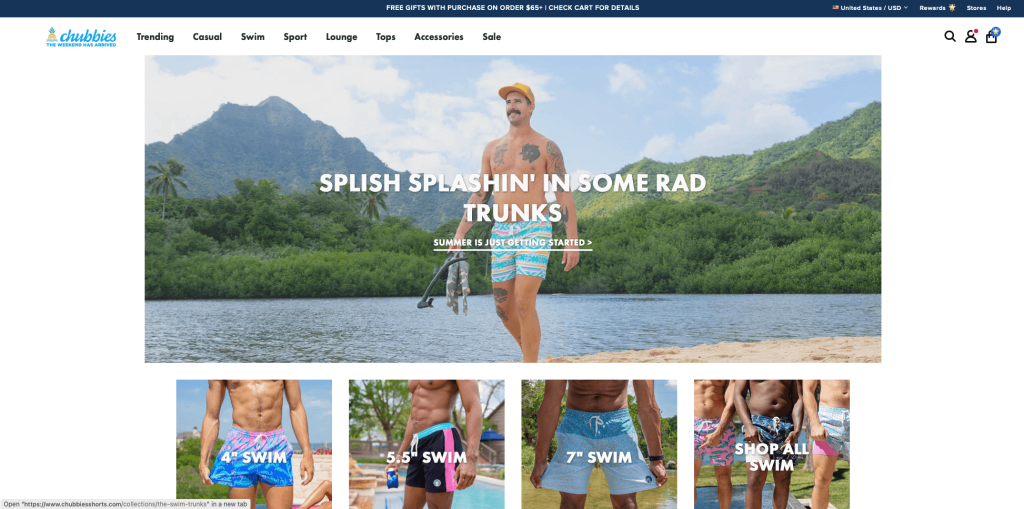 Chubbies هي شركة ملابس رجالية متخصصة في السراويل القصيرة. ما يجعل Chubbies فريدة من نوعها هو ألوانها النابضة بالحياة وأنماطها الممتعة. موقع الويب الخاص بهم ملفت للنظر وسهل التنقل فيه ، مما يجعل التسوق من خلاله متعة. تظهر جميع الصور الموجودة على الموقع الملاءمة والتعلق بعلامتها التجارية. لديهم لوحة ألوان جميلة لكل شيء: من الخط والنص ولون الخلفية. آخر شيء نود أن نذكره عن هذا الموقع هو أن لديهم وجهات نظر سطح المكتب والجوال ، وهي رائعة بنفس القدر. مع هذين الخيارين ، لن تتخلف أبدًا!