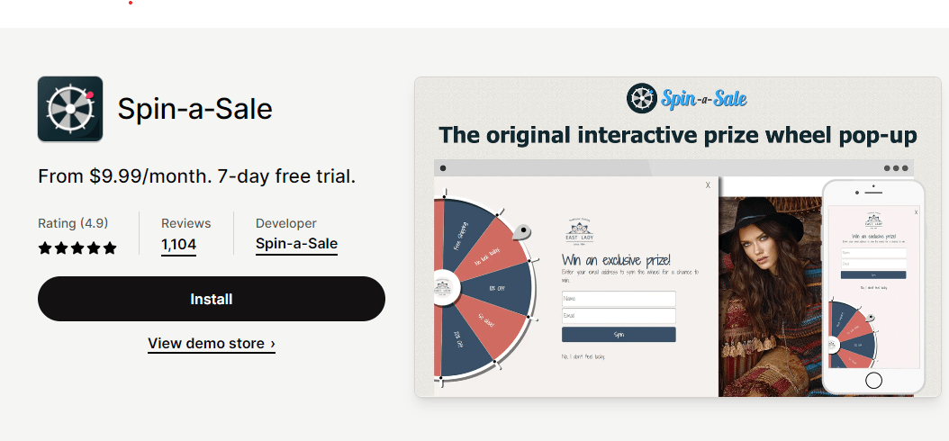 خيارنا التالي هو تطبيق Spin-a-Sale. لديه 1104 مراجعة وتقييم 4.9 نجوم على متجر تطبيقات Shopify. كما يوحي الاسم، يركز التطبيق على إنشاء ألعاب تدور قادرة على زيادة المبيعات.