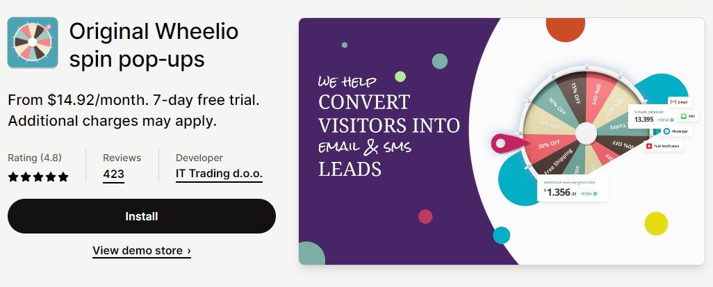 ما هي أفضل طريقة لتعزيز توليد العملاء المحتملين عبر البريد الإلكتروني والرسائل النصية القصيرة من خلال استخدام Wheelio؟ حصل على تقييم 4.8 في متجر تطبيقات Shopify. باستخدام Wheelio، يمكنك جعل متجر Shopify الخاص بك مسليًا من خلال إضفاء طابع الألعاب على موقع الويب الخاص بك.