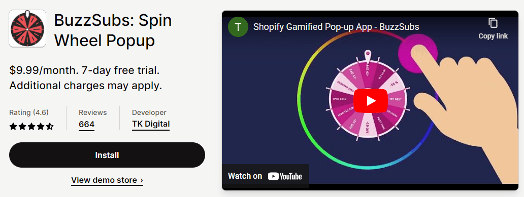 يعد BuzzSubs أحد أفضل تطبيقات الألعاب لـ Shopify. يمكنك إنشاء وتخصيص نافذة منبثقة لعجلة الدوران لتتناسب مع علامتك التجارية، وتغيير اللغة، وتشغيل النافذة المنبثقة تلقائيًا في وقت محدد.