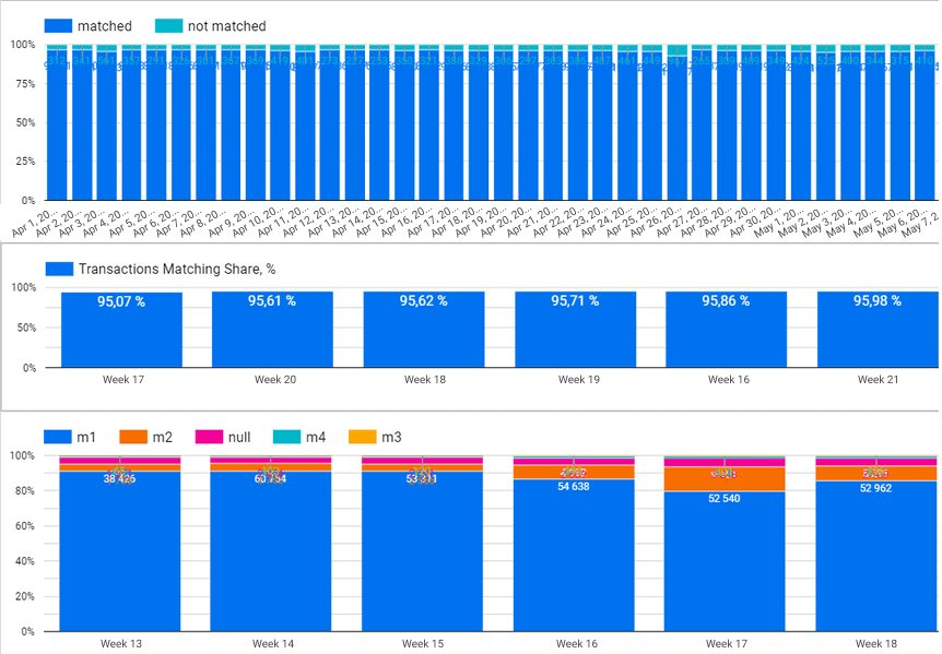 من خلال تطبيق منطق ربط البيانات الإضافي (الذي ساعده زملاؤنا في OWOX) ، رفع الفريق نسبة المطابقة من 40٪ إلى 85٪ مقبولة. ونظرًا لأن هذا التقرير يقدم ملاحظات حول الإجراءات على الواجهة الأمامية ، فقد تمكنوا في مرحلة ما من إصلاح الأخطاء الرئيسية على موقع الويب والحصول على نسبة مطابقة تبلغ 90٪.