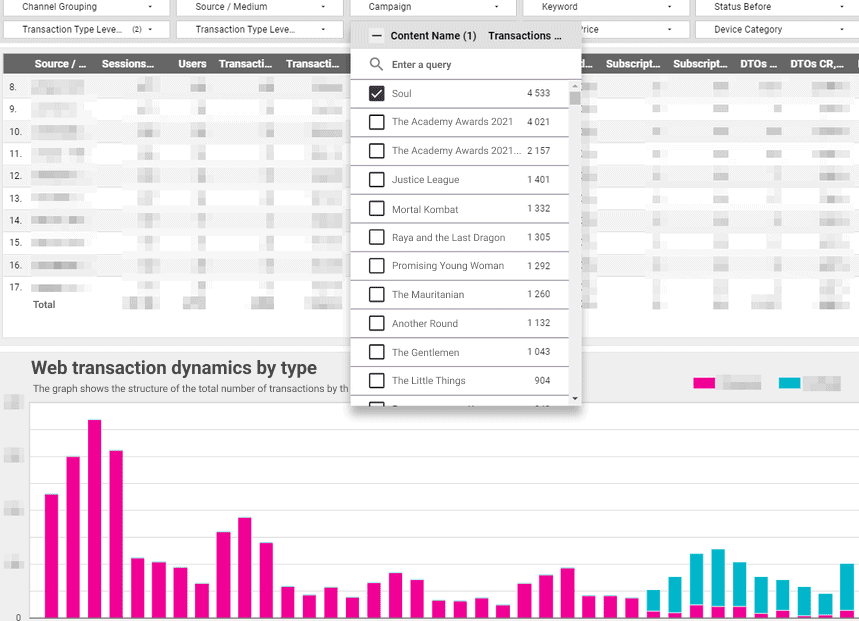 تحتوي لوحة القيادة على العديد من الخيارات لتسهيل عمل المسوقين. على سبيل المثال ، هناك عوامل تصفية لتحليل البيانات الخاصة بفيلم معين أو منتج معين وتتبع حالة المستخدم. على سبيل المثال ، قد يكون المستخدم قيد التجربة والاشتراك بعد الحملة. هناك العديد من الحالات المتشابهة: فهي تساعد في تقييم كيفية عمل الحملات الموجهة إلى مستخدمين معينين والنتائج في شرائح معينة.