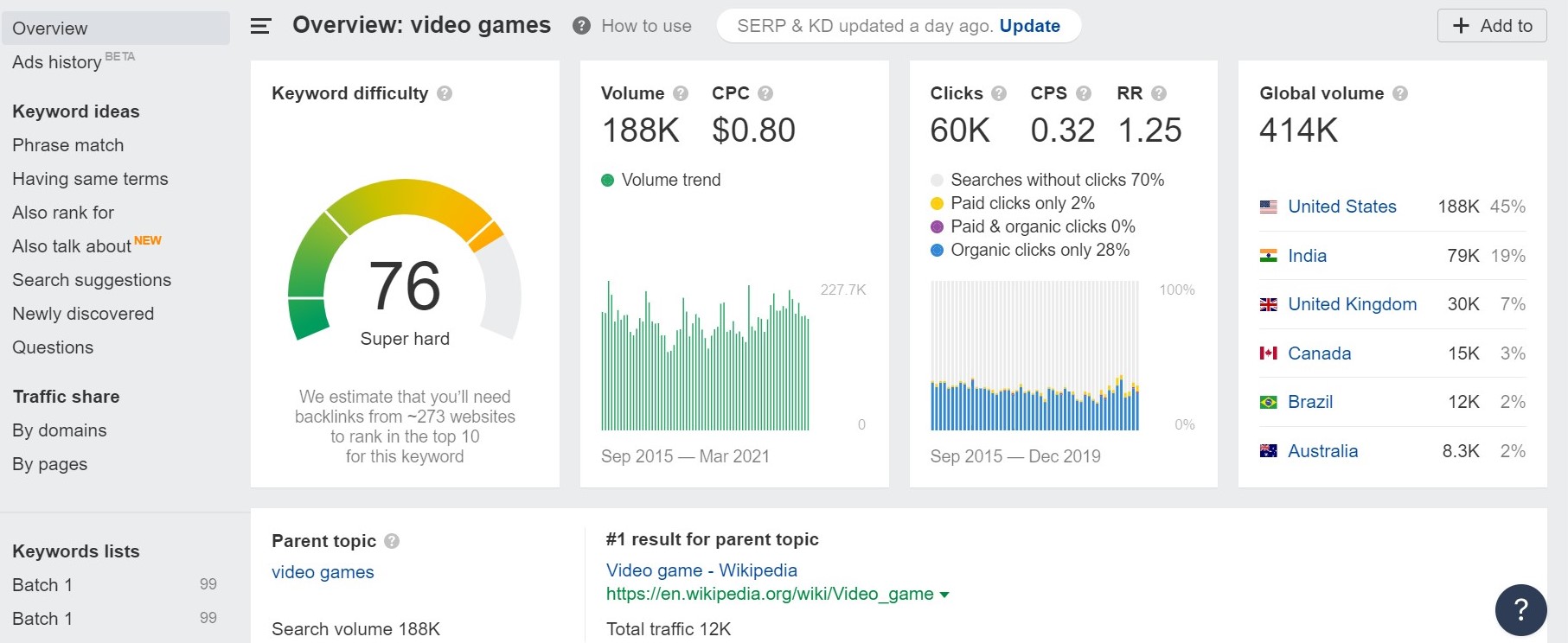 المنافذ المربحة يمكن أن تكون تنافسية. المفتاح هو تحقيق التوازن بين الكسب المحتمل والمنافسة. لتحديد السوق ومن تواجهه ، استهدف كلمات رئيسية محددة وقم بتشغيلها من خلال أداة تحسين محركات البحث مثل Ahrefs . باستخدام هذه الأداة ، يمكنك تدقيق المواقع المنافسة وفحص المجالات والتحقق من ملف تعريف الارتباط الخلفي. إنها طريقة ممتازة لاكتشاف الكلمات الرئيسية القوية التي ترغب في استهدافها وترتيبها. على سبيل المثال ، لنفترض أنك تتطلع إلى الدخول في مجال الألعاب. إذا قمت بتشغيل كلمة رئيسية مثل "ألعاب الفيديو" من خلال مستكشف الكلمات الرئيسية في Ahref ، فستظهر لوحة القيادة هذه ، وستكون قادرًا على عرض مقاييس مثل حجم البحث شهريًا في الولايات المتحدة وفي جميع أنحاء العالم. ستحصل أيضًا على تقدير لعدد الروابط الخلفية التي من المحتمل أن تحتاج إلى تصنيفها في المراكز العشرة الأولى لهذه الكلمة الرئيسية المحددة.