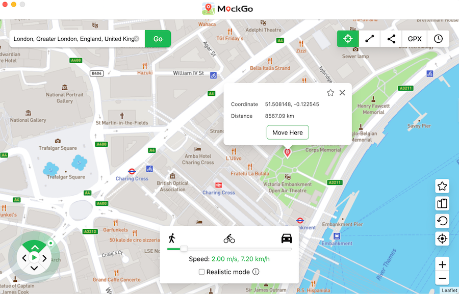 يتيح لك التطبيق إنشاء طرق بين موقعين مختلفين بناءً على طرق حقيقية. كما يسمح لك بإنشاء مسارات لتغطية أماكن متعددة. يمكنك محاكاة السرعة بناءً على أنشطة القيادة وركوب الدراجات والمشي. الميزة الفريدة التي تقدمها MockGo هي الوضع الواقعي. هنا ، يمكنك تغيير السرعة بنسبة -30٪ إلى + 30٪ كل 5 ثوانٍ.