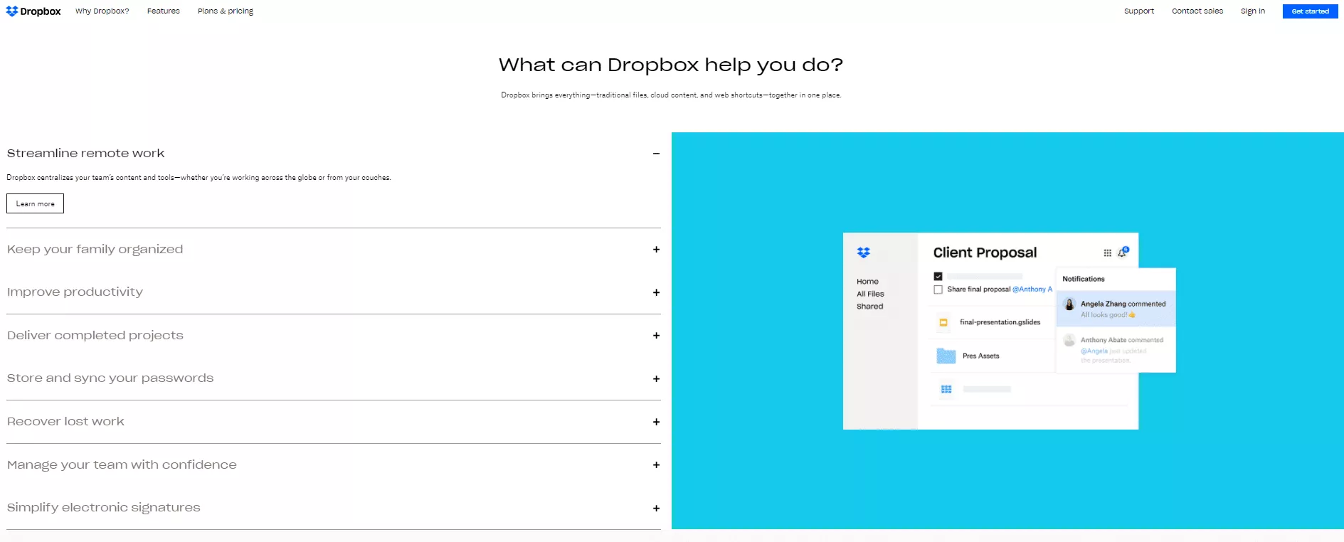يستخدم Dropbox تصميم ويب مبسطًا لمساعدتهم على تحويل آفاقهم المحتملة. على صفحته الرئيسية مباشرة ، يتضمن قائمة بالميزات الرئيسية التي يقدمها Dropbox. إنها قائمة قابلة للتوسيع توجه الزائرين إلى صفحات معينة لتوجيههم للاشتراك في الخدمة.