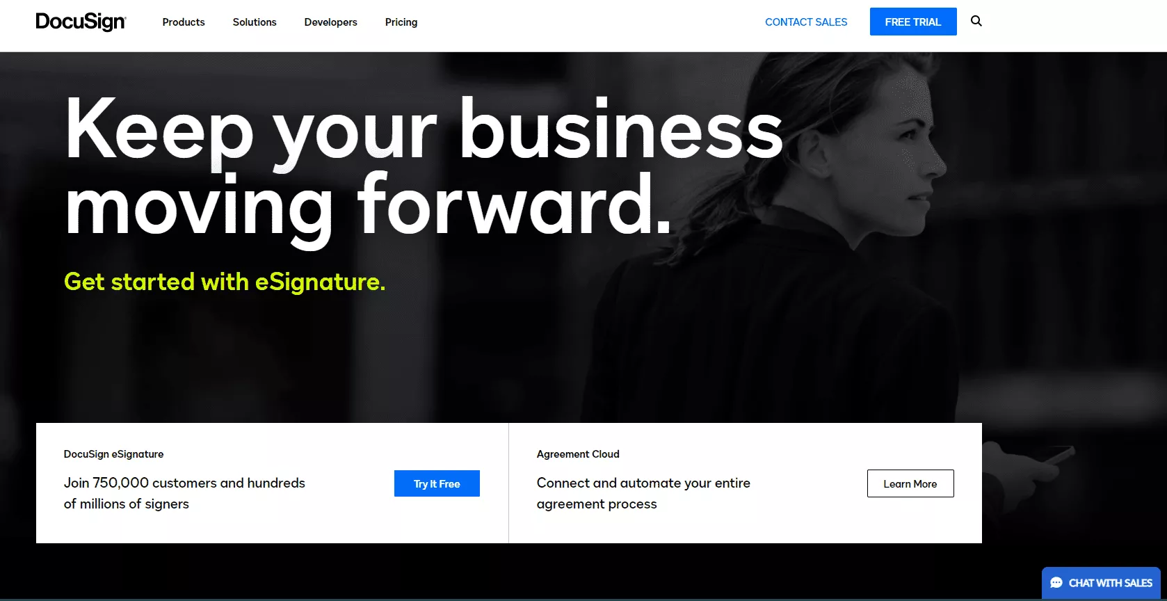 إذا اضطررت في أي وقت إلى توقيع أوراق رسمية عبر الإنترنت ، فهناك فرصة جيدة لاستخدام DocuSign بنفسك. يستخدمون الدليل الاجتماعي على صفحتهم المقصودة ليعلنوا أن "750.000 عميل ومئات الملايين من الموقعين" قد استخدموا منتجهم بالفعل. ينفذ رجال الأعمال اثنين من أفضل أدوات التسويق الرقمي ، ويقدمون نسخة تجريبية مجانية ومحادثة مباشرة مع فريقهم.