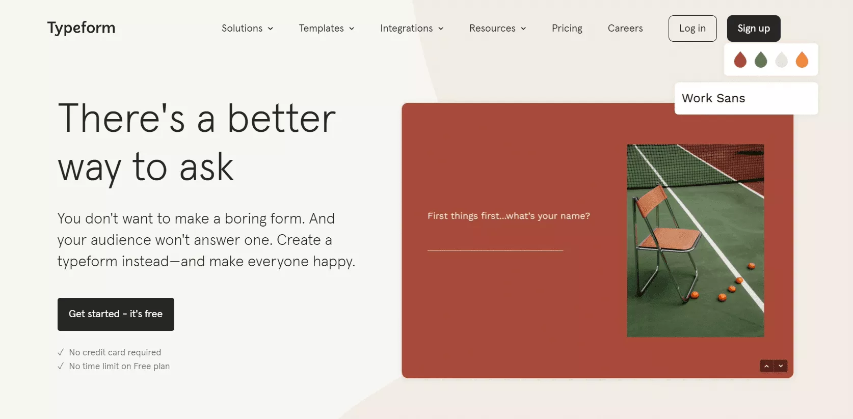 يجعل Typeform ملء النماذج عبر الإنترنت يبدو ممتعًا وسهلاً بتصميمه التفاعلي والنظيف. يستخدم لوحة ألوان صامتة وهي سهلة بشكل خاص على العين. تركز العلامة التجارية على