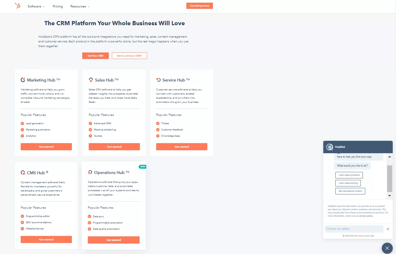 يوفر Hubspot برنامج CRM لمجموعة واسعة من المستخدمين. لقد أوضحوا هذه النقطة على صفحتهم من خلال سرد خدماتهم المختلفة والميزات الأكثر شيوعًا. لديهم أيضًا ميزة الدردشة الحية مع العديد من أزرار CTA المختلفة. يتم توجيه الزوار نحو تجربة خدمة معينة ، أو تجربتها مجانًا ، أو الحصول على عرض توضيحي متميز.