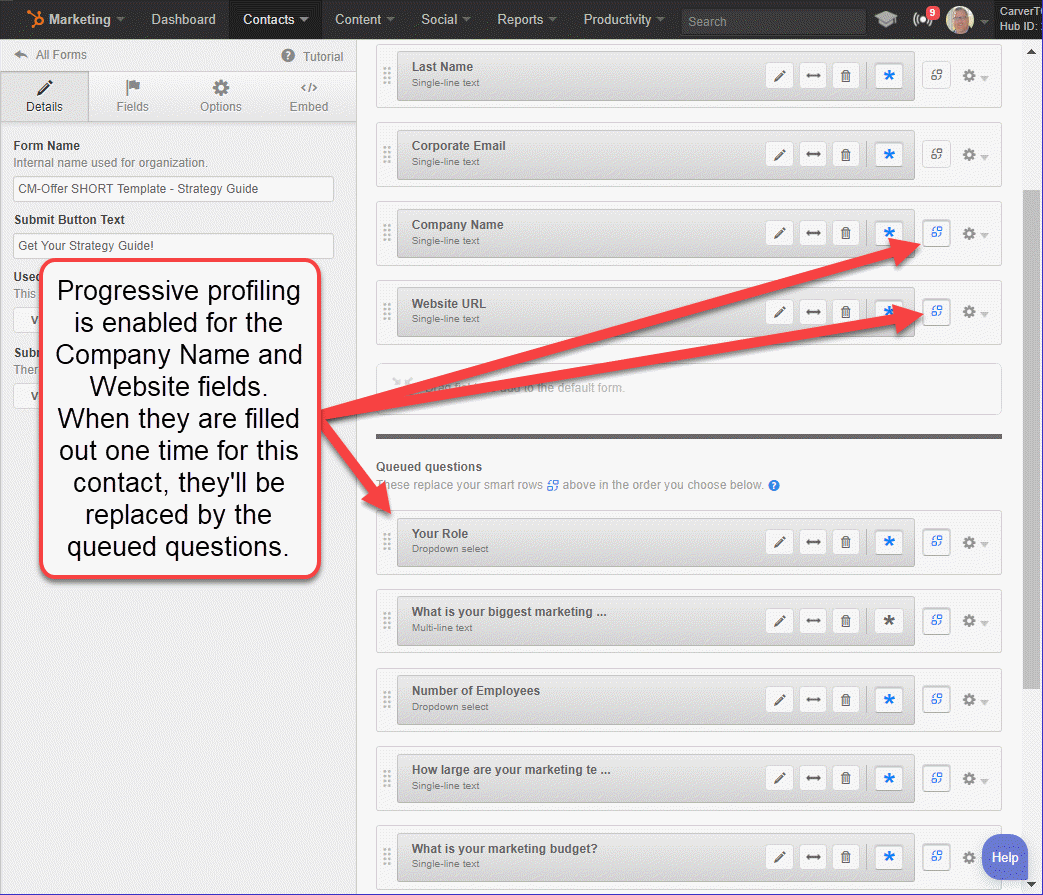 على سبيل المثال ، يعمل التنميط التدريجي عن طريق تتبع المعلومات التي قدمتها جهة اتصال بالفعل ، واستبدال الأسئلة الجديدة في النماذج بالأسئلة التي أجابت جهات الاتصال عنها بالفعل. لذا ، بينما تستمر جهات الاتصال في التفاعل معك ، وتتحرك في مسار التحويل الخاص بك ، فإنك تتعلم المزيد عنها.