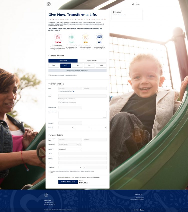 بينما يمكن أن تقف صفحة التبرع بمفردها ، فهي أيضًا جزء من تدفق الخروج لأنواع الحملات الأخرى. على سبيل المثال ، انظر إلى الطريقة التي أنشأ بها Casa Central صفحة التبرع الخاصة بهم للتأكد من أنها جذابة بما يكفي لجذب شخص ما إليها ، لكنها لا تزال قوية بما يكفي للوقوف بمفردها: