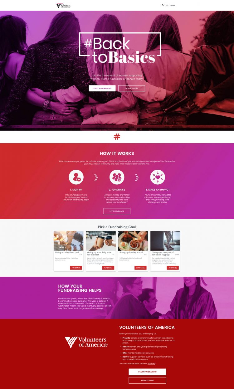 تتغير عبارة الحث على اتخاذ إجراء من "التبرع لمرة واحدة" إلى "الاشتراك لجمع التبرعات نيابة عنا". إذا كنت تريد إخبار قصة مؤسستك غير الربحية بالصور والنص السردي ، وتشرح قوة الهدية من خلال كتل التأثير ، فقد ترغب في اختيار حملة تمويل جماعي على صفحة تبرع.