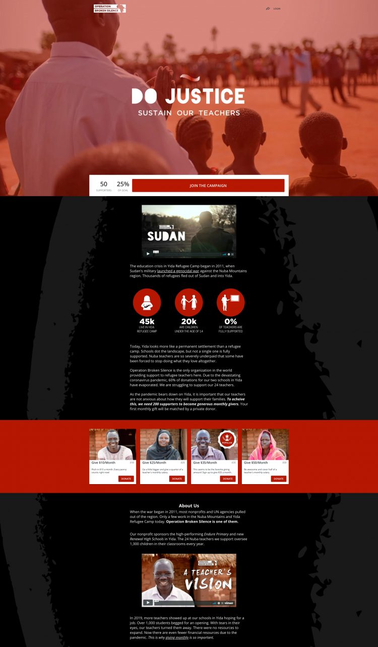 يمكنك أيضًا استخدام حملة تمويل جماعي لإنشاء برنامج تبرعات متكرر مخصص. الأشياء الوحيدة التي تتغير هي الدعوة إلى العمل ، والتي تحول التركيز من التبرع لمرة واحدة إلى التبرع المتكرر شهريًا والجدول الزمني. غالبًا ما تكون برامج العطاء المتكررة دائمة الخضرة. قامت عملية Broken Silence ببناء برنامج تبرعات متكرر على هذا النحو:
