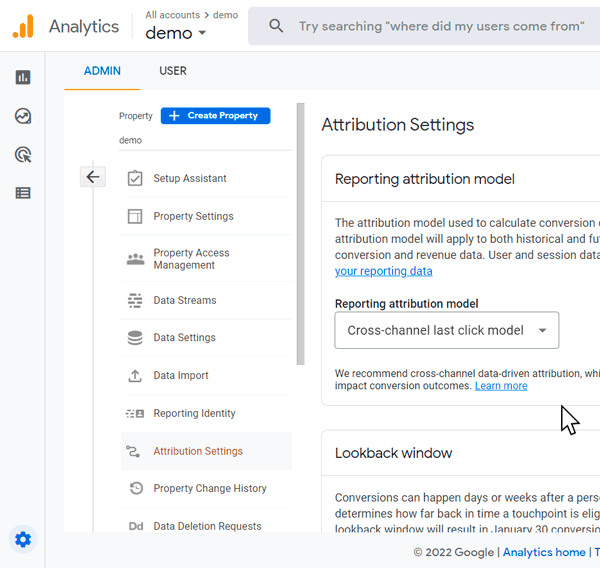 ملاحظة: نظرًا لأن التحويلات يمكن أن تحدث بعد أيام من التفاعل مع الإعلانات ، فإن إعدادات فترة المراجعة تسير جنبًا إلى جنب مع إعدادات الإحالة. في New Analytics ، هناك خياران: