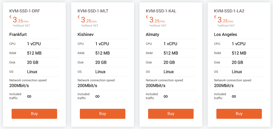 - 5.70 دولار شهريًا لـ 1vCPU ، وتخزين 30 جيجابايت ، وذاكرة وصول عشوائي 1 جيجابايت ، ونظام تشغيل Linux مع حركة مرور غير محدودة وسرعة اتصال شبكة 200 ميجابت / ثانية