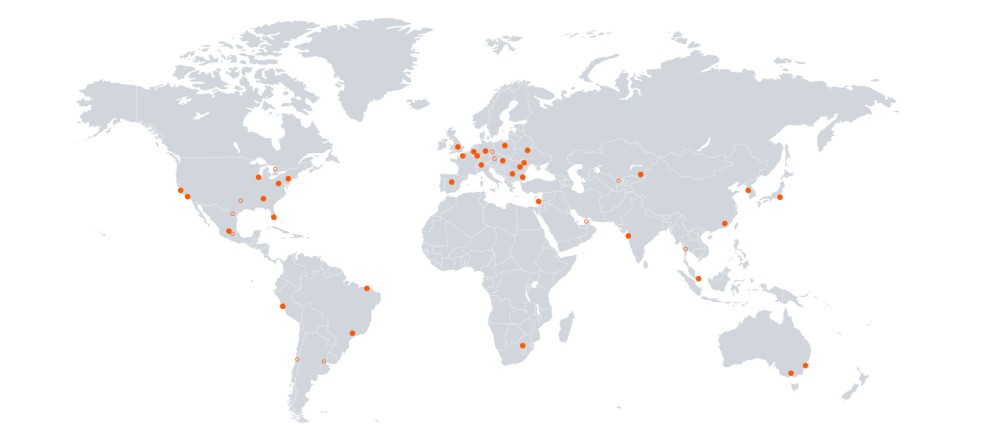 تشمل المدن التي توجد بها الخوادم أمستردام وألماتي وأتلانتا وأشبورن وبودابست وبوخارست وشيكاغو وفرانكفورت وجوهانسبرغ وهونغ كونغ وإسطنبول وكييف وكيشينيف ولندن ولوكسمبورغ ولوس أنجلوس ومدريد وميامي وملبورن ومومباي ، ميلان ونيويورك وباريس وسيول وسانتياغو دي كويريتارو وسانتا كلارا وسنغافورة وسيدني وصوفيا وساو باولو وطوكيو وتل أبيب ووارسو.