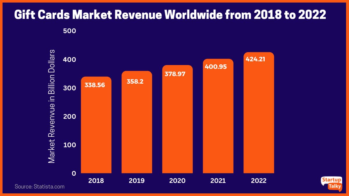 تم تسجيل حجم سوق بطاقات الهدايا العالمية عند 437.78 مليار دولار أمريكي في عام 2020. ومن المتوقع أن ينمو بمعدل نمو سنوي مركب 15.4٪ ليصل إلى حجم سوق يبلغ 1396.01 مليار دولار أمريكي بين عامي 2021 و 2028. وفقًا لتحليل السوق الإقليمي ، خلال نفس الفترة بين عامي 2021 و 2028 ، من المتوقع أن ينمو سوق بطاقات الهدايا في منطقة آسيا والمحيط الهادئ بمعدل نمو سنوي مركب يبلغ 16.0٪ لتوليد إيرادات تبلغ 301.54 مليار دولار أمريكي. بين عامي 2022 و 2027 ، من المتوقع أن ينمو سوق بطاقات الهدايا في الهند بمعدل نمو سنوي مركب يزيد عن 19.1٪ لتصل إلى قيمة سوقية تبلغ 93.96 مليار دولار أمريكي بحلول عام 2027.