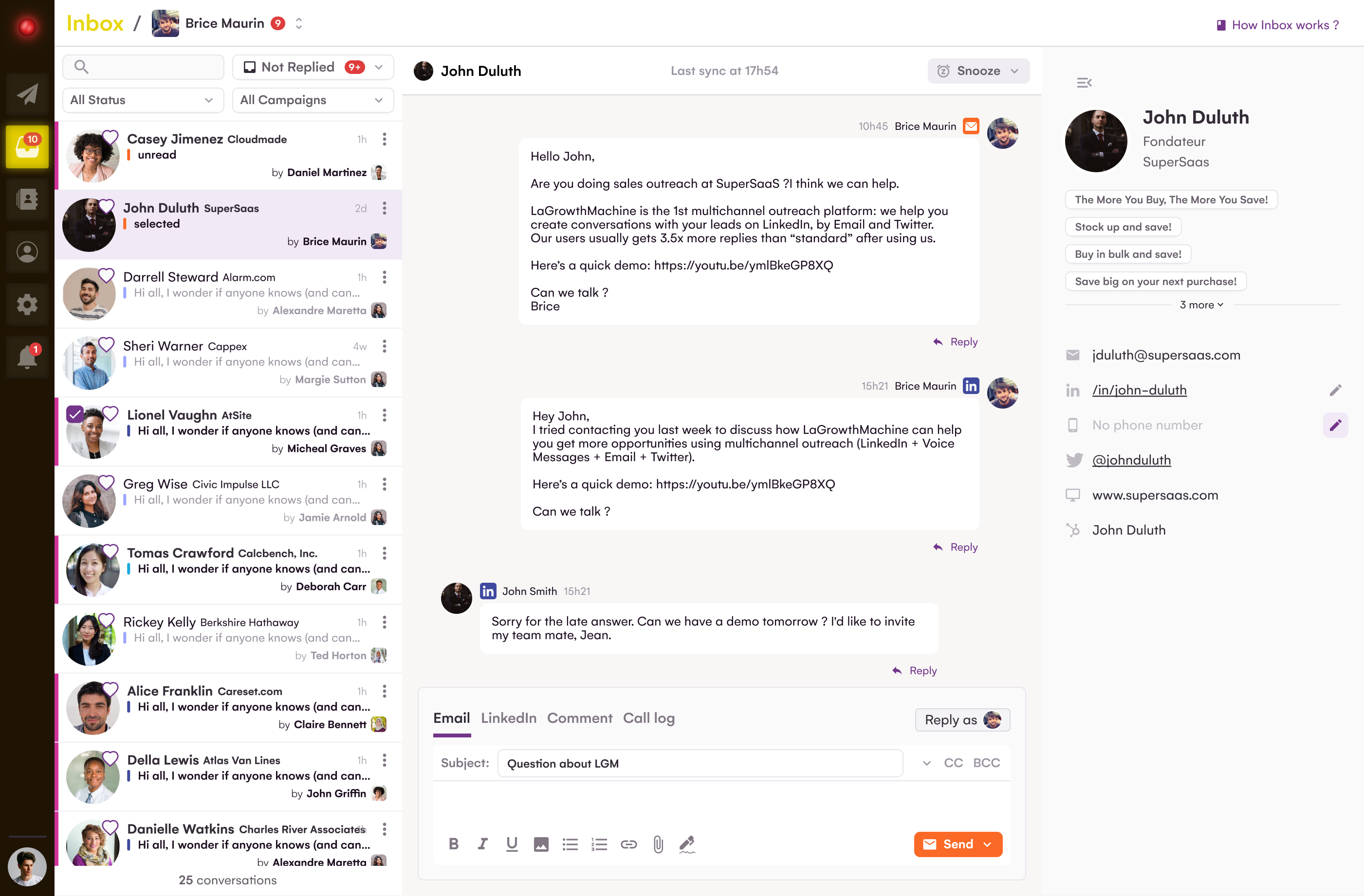 هل ترغب في تحسين كفاءة قسم المبيعات لديك؟ باستخدام LaGrowthMachine ، يمكنك إنشاء عملاء محتملين بمعدل 3.5 ضعفًا أكثر مع توفير قدر لا يُصدق من الوقت في جميع عملياتك.