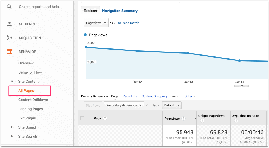 لمشاهدة حركة المرور الناتجة عن منشورات المدونة الفردية ، انتقل إلى السلوك> محتوى الموقع> جميع الصفحات: