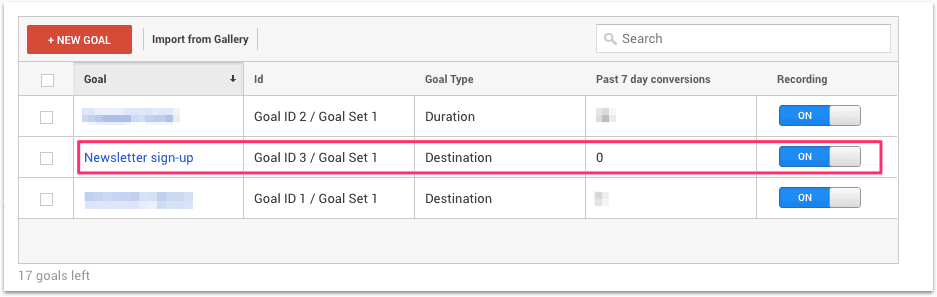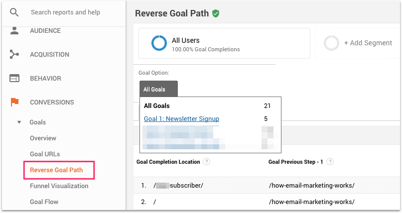 في القائمة المنسدلة " جميع الأهداف" ، انقر فوق هدف المشترك الجديد (في هذه الحالة "الهدف 1: الاشتراك في النشرة الإخبارية"):