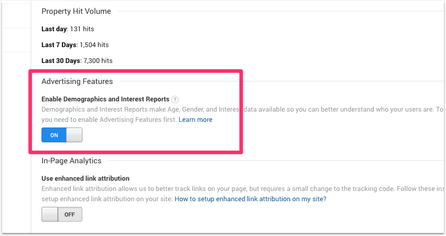 بدّل تمكين تقارير الخصائص الديمغرافية والاهتمامات إلى الوضع "تشغيل".