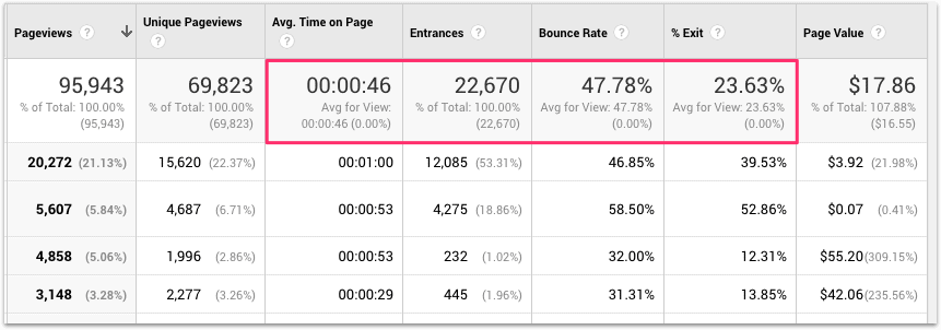 يعرض الصف العلوي على هذه الشاشة متوسطات بعض المقاييس الرئيسية - متوسط الوقت على الصفحة ، ومتوسط معدل الارتداد ، ومتوسط معدل الخروج :