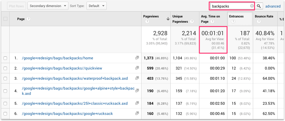 ولكن عندما أكتب "حقائب الظهر" ، أرى أن متوسط الوقت المستغرق في الصفحة لهذا المحتوى هو دقيقة واحدة وثانية واحدة: