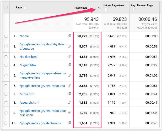 انقر داخل الخلية العلوية للعمود الأول لترتيب المحتوى الخاص بك حسب عدد مشاهدات الصفحة ، من الأعلى إلى الأقل:
