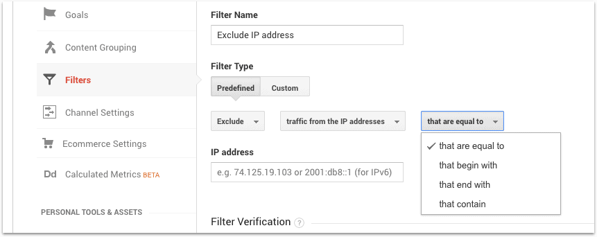 اختر نوع الفلتر المحدد مسبقًا ، وفي القائمة المنسدلة اختر استبعاد :