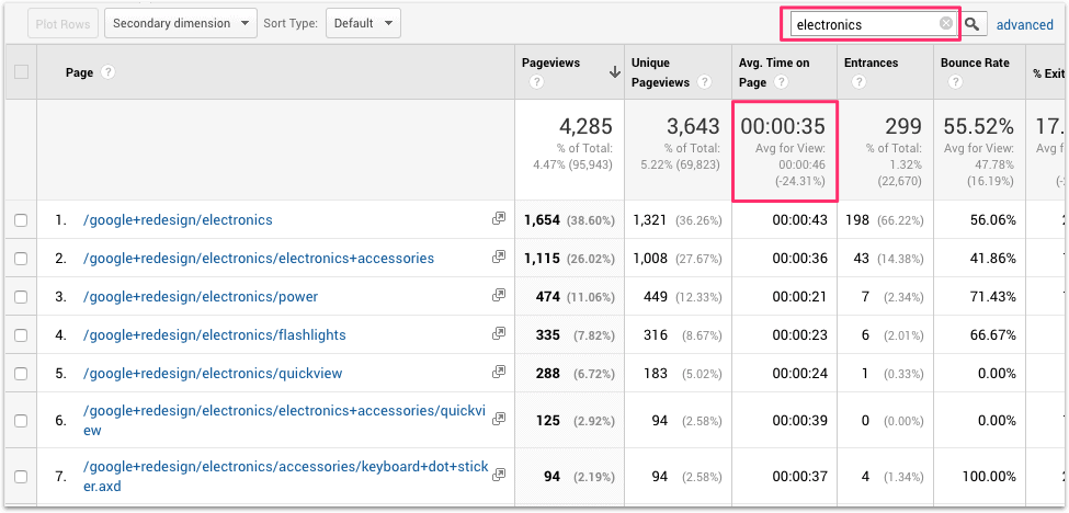 أستطيع أن أرى أن متوسط الوقت المستغرق في الصفحة للمحتوى الذي يحتوي على الكلمة الرئيسية "إلكترونيات" في عنوان URL هو 35 ثانية: