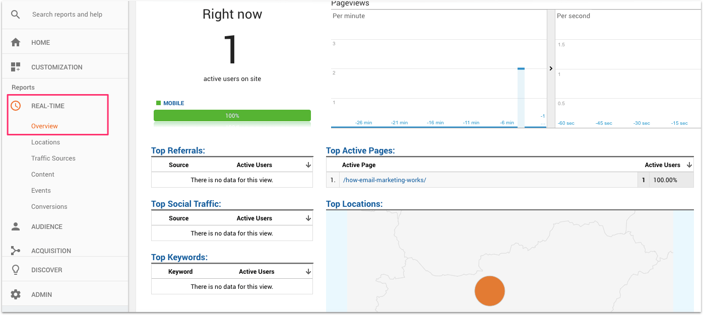 للتحقق من عمل الفلتر ، انتقل إلى الوقت الفعلي في شريط التنقل الأيمن ، ثم نظرة عامة :