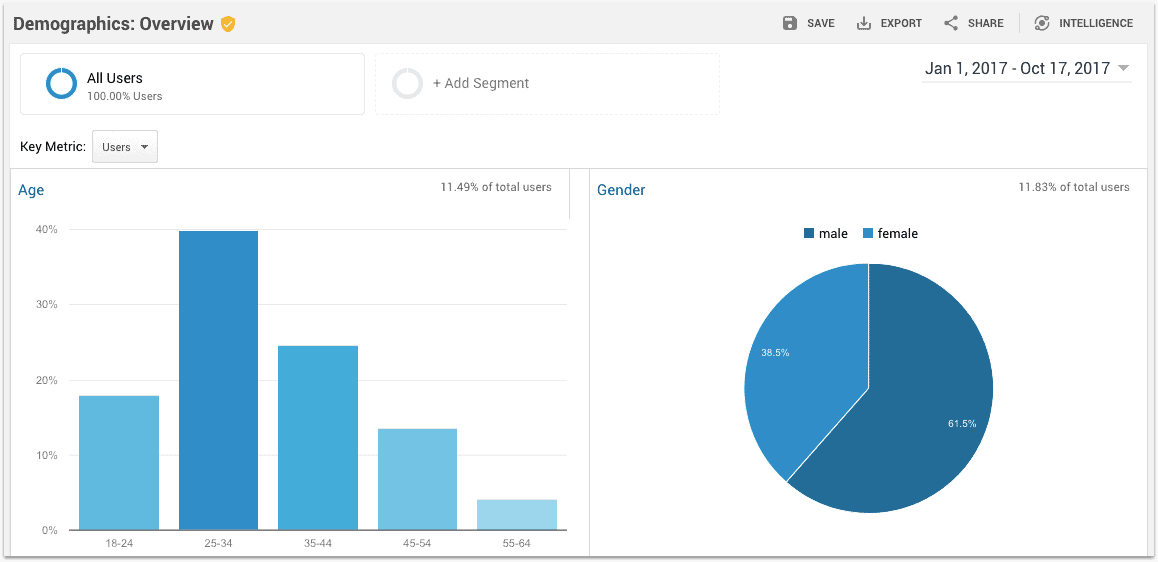 ضمن قسم الجمهور ، ضمن القسم الفرعي الديموغرافيات ، يمكنك رؤية بعض المعلومات المفيدة عن جمهورك: