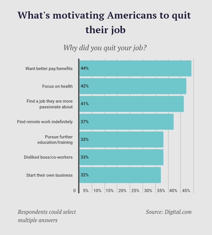 وفقًا لاستطلاع حديث ، هناك العديد من الأسباب - 44٪ يسعون للحصول على رواتب ومزايا أفضل ، و 41٪ يرغبون في العثور على وظيفة أكثر شغفًا بها ، و 32٪ يريدون بدء أعمالهم التجارية الخاصة.