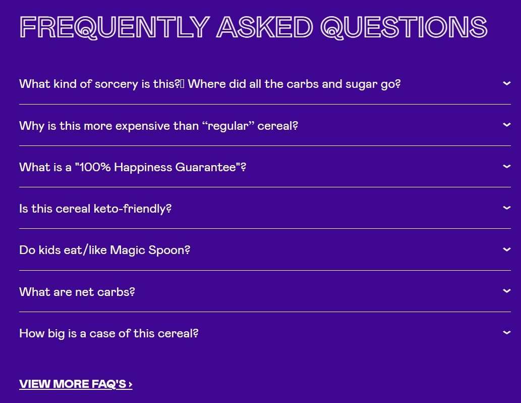إذا كان لدى المستهلكين أسئلة شائعة حول منتجك ، فيمكنك إنشاء قسم للأسئلة الشائعة دون ازدحام مساحة وصف المنتج ، مثل هذا المثال من شركة الحبوب الصحية ، Magic Spoon.