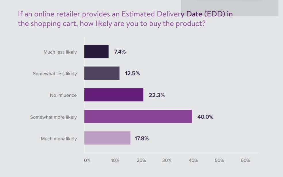 قال 83٪ من المستهلكين في استطلاع 2018 Narvar أنهم يتوقعون اتصالات منتظمة وتحديثات حول طلباتهم. في استطلاع أجرته 2020 Convey ، قال 57.8٪ من المستهلكين إنهم إلى حد ما أو أكثر احتمالية للشراء إذا قدم تجار التجزئة تاريخ تسليم تقديري (لقطة شاشة) (EDD) في عربة التسوق قبل بدء عملية الدفع ".