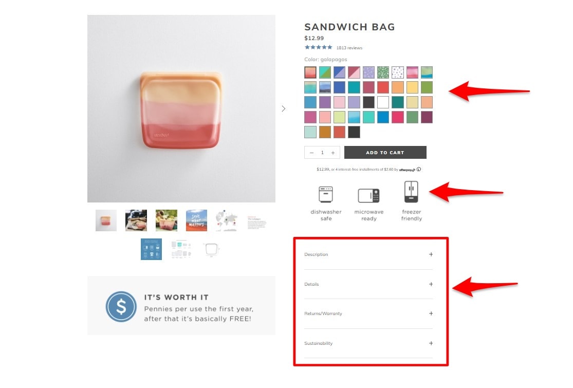 على سبيل المثال ، تمتلك شركة Stasher - وهي شركة تصنع أكياس سيليكون غير سامة - صفحة منتج مثالية. تحدد الألوان المختلفة التي تأتي بها الحقيبة ، وتحتوي على معرفات مرئية لسرد ميزات المنتج وتحتوي على معلومات حول إرجاع العنصر والضمان والاستدامة.