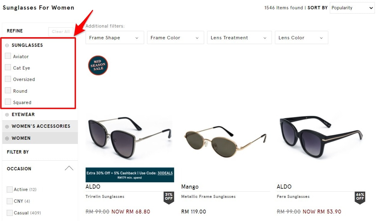 على سبيل المثال ، تعرف العلامة التجارية للأزياء ونمط الحياة ، Zalora ، أن مشتريها يهتمون أكثر بالشكل أثناء التسوق لشراء النظارات الشمسية أكثر من أي معلمة أخرى ، لذلك يسلطون الضوء عليها في قائمة التصفية الخاصة بهم.
