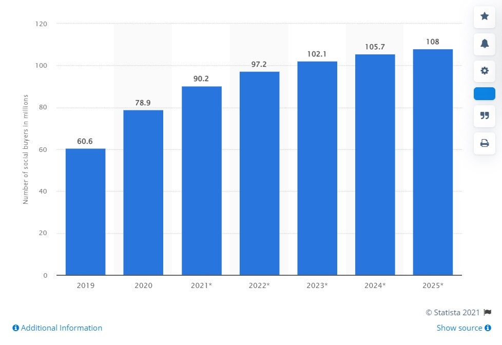 إلى جانب تجربة المتاجر الجديدة ، بدأ المستهلكون أيضًا في استخدام وسائل التواصل الاجتماعي للتسوق عبر الإنترنت - مما أدى إلى ظهور التجارة الاجتماعية. في عام 2020 ، كان لدى الولايات المتحدة 79 مليون مشتري اجتماعي. وفقًا لبيانات Statista ، من المتوقع أن ينمو هذا الرقم بنسبة 37٪ تقريبًا بحلول عام 2025.